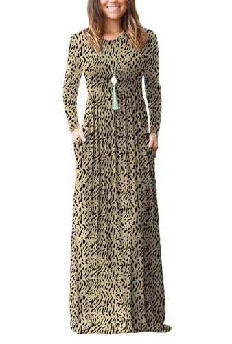 EUOVMY Long Sleeve Floral Maxi Dresses for Women Leopard Khaki Small Round Neck Boho A-line Casual Hawaiian Sundress Flowy Elegant Party Vacation Spring Summer Beach Long Sun Dresses with Pockets