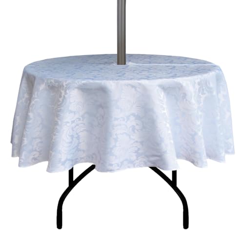 youngseahome Damask Outdoor Tablecloth Water Resistant Polyester Fabric Table Cover with Zipper Umbrella Hole for Garden Patio Tabletop 60Inch Round,White