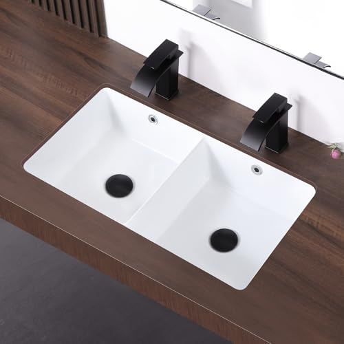 KARAMAG 27 Inch Undermount Bathroom Sink Rectangle Undermount Double Sink White Ceramic Under Counter Bathroom Sinks with Overflow (26.8"x15.0")