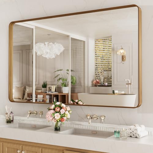 LOAAO 60X40 Inch Bathroom Mirror with Wood Grain Colored Metal Frame, Rounded Rectangle Metal Framed Bathroom Mirror, Anti-Rust, Hangs Horizontally or Vertically, Tempered Glass