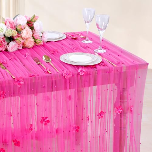 LuoluoHouse Flower Pearl Tulle Table Cloth: 3 Pieces 60x120 Inch Hot Pink Lace Table Runner Flower Decor Tulle Fabric for Chiffon Wedding Birthday Party Table Decoration