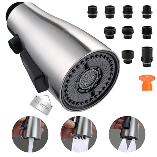 Pull Down Kitchen Faucet Head Replacement, 3-Function Metal Kitchen Faucet Head High Pressure Kitchen Sink Sprayer Replacement with 9 Adapters Compatible with American Standard, Brushed Nickel