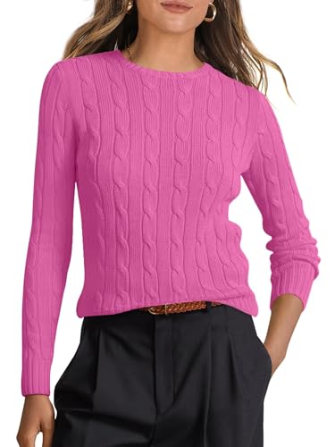 ANRABESS Womens Long Sleeve Cable Knit Sweater Jumper Crewneck Pullover Soft Dressy Casual Tops Cute 2025 Fall Trendy Outfits Hot Pink Medium