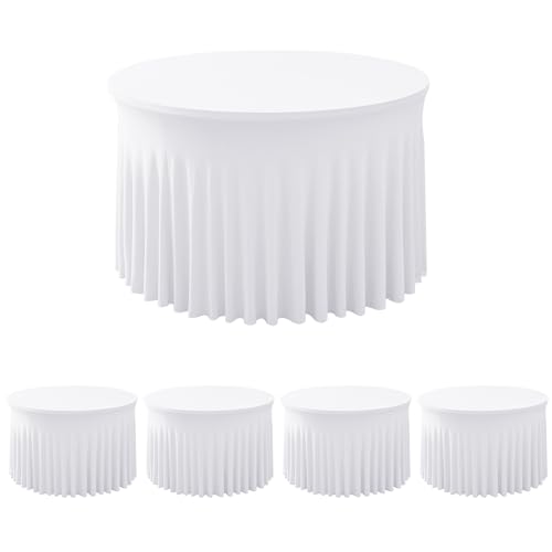 HolidayIdeas White Spandex Wedding Tablecloths for 60in Round Table, 5ft Fitted Stretch Table Skirts 120 Inch, Wrinkle-Free Ruffle Design Tablecloths for Banquets,Trade Shows, Parties, Events, 4 Pack