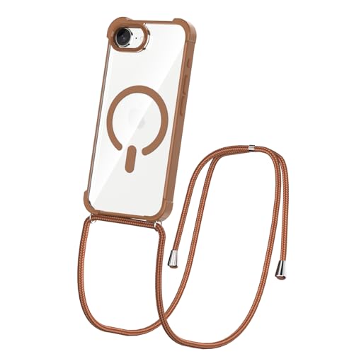 CAROKI Magnetic Crossbody Lanyard Case for iPhone 16e, Ultra Clear Case Compatible with MagSafe 4 Corners Bumper with Strap Adjustable Neck Cord Necklace Cover for iPhone 16e-Coffee