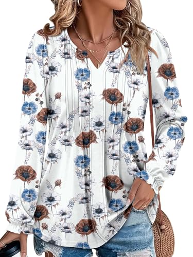 Angerella Womens Long Sleeve Shirts Loose Fit Womens Tops Casual V Neck T Shirts Soft Basic Tees Business Work Blouses,BrownFlower,Small