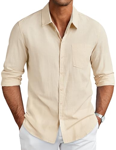 COOFANDY Men's Linen Shirts Long Sleeve Casual Shirts Button Down Shirts for Men Solid Spread Collar Beach Summer Work Shirts Khaki