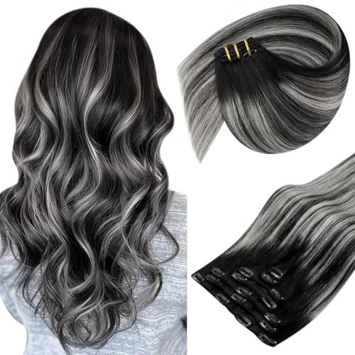 Sunny Hair Clip in Hair Extensions Straight Human Hair Clip in Extensions Remy Clip in Hair Extensions Real Human Hair Extensions Clip ins Black Ombre Grey Blonde with Black Full Head 22inch