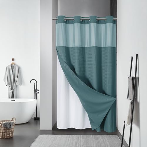 eachope SeawedGreen No Hook Waffle Weave Shower Curtain with snap-in Liner Replacement, 230GSM Waterproof Fabric Hotel Shower Curtain Set for Bathroom, Through Mesh Top Window,54Wx80H