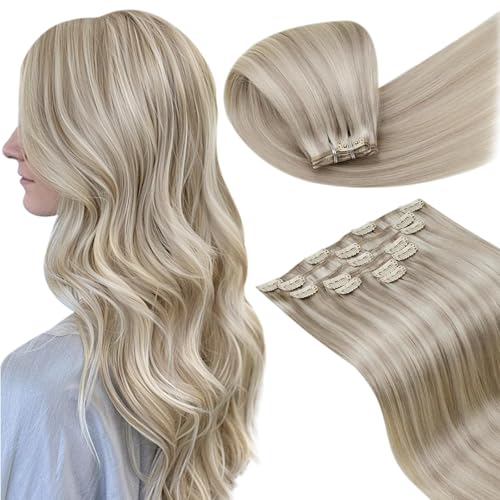 LaaVoo Human Hair Clip in Extensions Blonde Highlight 24 Inch Clip in Hair Extensions Human Hair Ash Blonde with Blonde Hair Extensions Clip ins Full Head 7pcs/140g