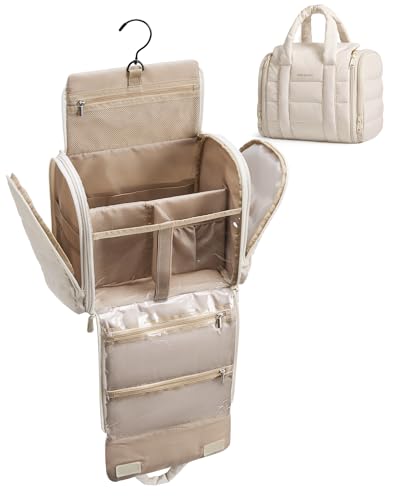 BAGSMART Toiletry Bag for Women with Hanging Hook, Puffy Water-resistant Makeup Cosmetic Bag for Accessories, Shampoo, Full-size Container, Toiletries, Beige