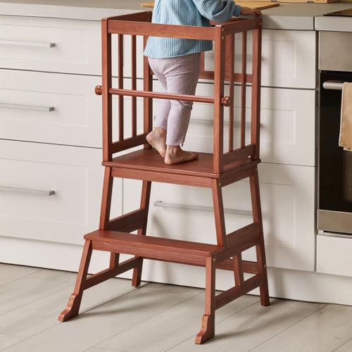 COSYLAND Kids Kitchen Step Stool, Toddler Standing Tower with CPC Certification, Removable Anti-Drop Railing Safety Rail Enjoys Unique Patented Design A Anti-tip Stable Structure Brown