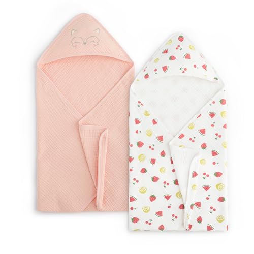 PHF 100% Muslin Cotton Baby Hooded Towels, 2 Pack Bath Towel with Hood for Newborn, Infant, Toddler, Ultra Soft and Absorbent Baby Bath Essentials, Shower Gifts for Girls, 32x32Inch, Fruits