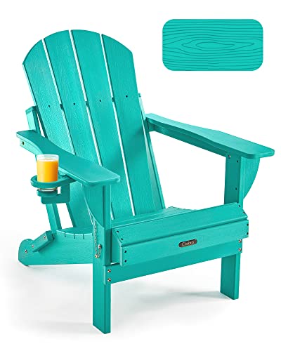 Ciokea Folding Adirondack Chair Wood Texture, Patio Adirondack Chair Weather Resistant, Plastic Fire Pit Chair with Cup Holder, Lawn Chair for Outdoor Porch Garden Backyard Deck (Lake Blue)