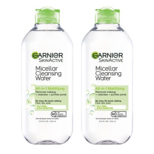 Garnier Micellar Water for Oily Skin, Facial Cleanser & Makeup Remover, Mattifying, For All Skin Types, Vegan, Cruelty Free, 13.5 Fl Oz (400mL), 2 Count