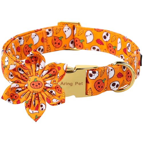 ARING PET Halloween Dog Collar with Flower, Cotton Orange Pumpkin Ghost Pets Necklace Collars with Metal Buckle for Puppy Small Medium Large Girl Boy Dogs-L