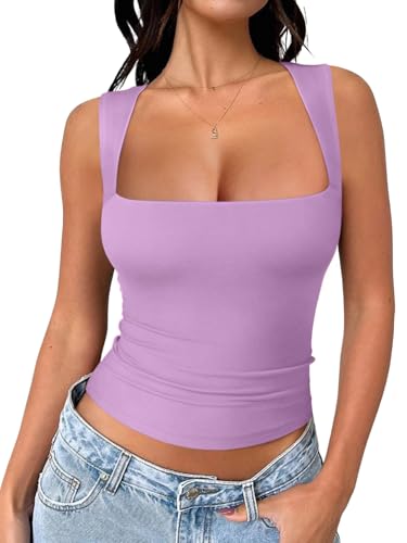 REORIA Women's Summer Tank Crop Tops 2025 Going Out Square Neck Basic Sleeveless Corset Double Lined Party Club Clothes Vacation Outfits Purple X-Large