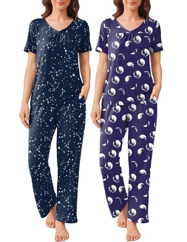 Ekouaer 2 Pack Womens Pajamas Sets Clearance, Short Sleeve with Long Pant Pjs Sleepwear Navy Moon Blue Stars Small