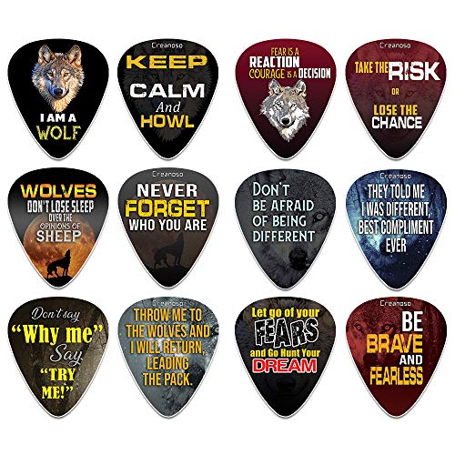 Creanoso Acoustic Guitar Picks Courage Wolf (12-Pack) - Medium Gauge Celluloid - Premium Music Gifts & Guitar Accessories for Boys Son Men Him Husband Dad Boyfriend Musician Gift
