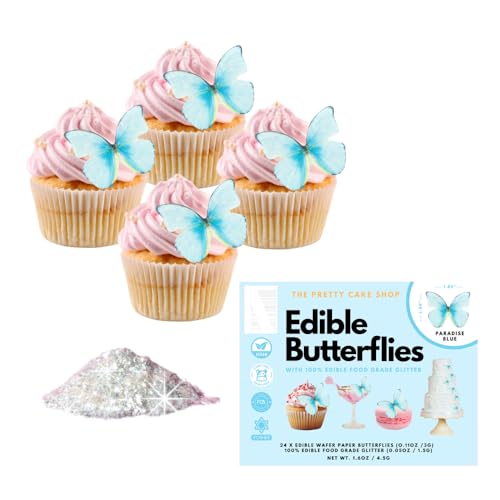 Edible Butterflies with Edible Glitter - Wafer Paper Butterflies for Cake Decorating - Edible Glitter - Birthday Decorations - Cupcake Decorations - Cake Decorations - Cake Toppers (Paradise Blue)