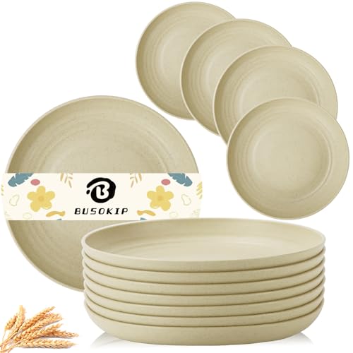 BUSOKIP Deep Dinner Plates Set of 8, Wheat Straw Plate 9 Inch, Lightweight and Unbreakable Plastic Plate Reusable, Microwave & Dishwasher Safe Camping Plates for Picnic, Outdoor, Travel (Beige)