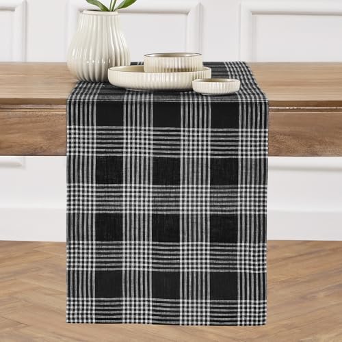 Solino Home Linen Table Runner 60 Inches - 100% Pure Linen Glen Check Black and White Table Runner 14 x 60 Inch Ideal for Dresser and Coffee Tables - Thanksgiving