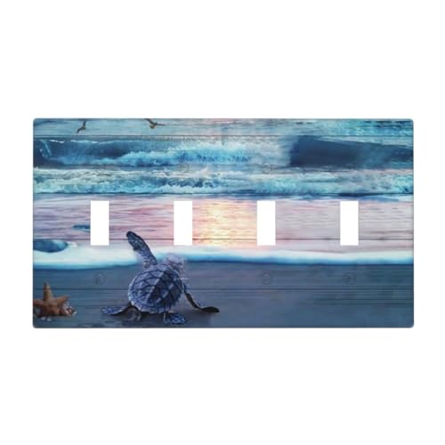 Funny Summer Hawaii Starfish Beach Wave Turtle Four Gang Light Switch Cover, Conch Coral Coastal Nautical Ocean Blue Turtle Tortoise 4 Gang Quad Toggle Switch Wall Plate Outlet Cover Standard Size