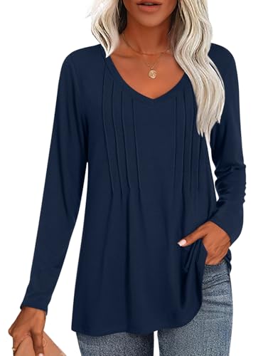 HOTGIFT 2025 Womens Tops Long Sleeve Shirts Casual Fall Winter Tunics Pleated V Neck Fashion Navy Blue Large