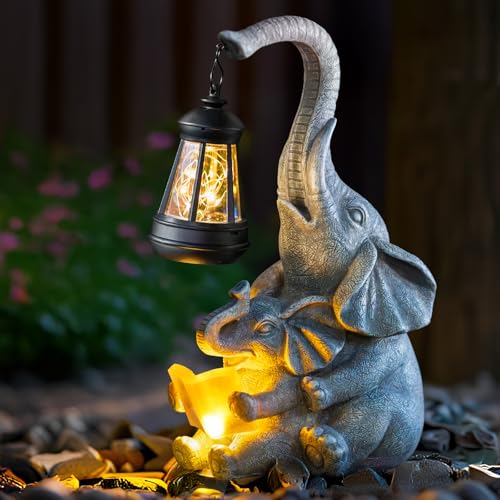 Candieslife Solar Garden Statue Lights Loving Elephants Figurine with Solar Lantern, Outdoor Yard Decorations for Patio Porch Home, Housewarming Elephant Gifts for Mom, Women