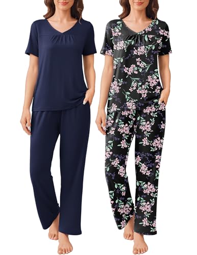 Ekouaer 2 Pack Women Pajamas Sets, Short Sleeve with Long Pant Pjs Sleepwear Black Flowers Navy Blue XX-Large