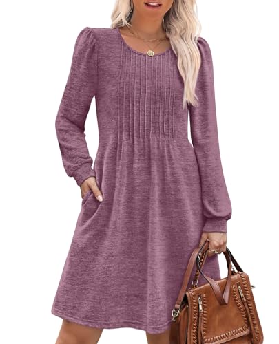 OFEEFAN Dresses for Women 2025 Elegant Classy Fall Dresses for Women 2025 Pleated Crew Neck Long Sleeve Sweater Dress Purple XL