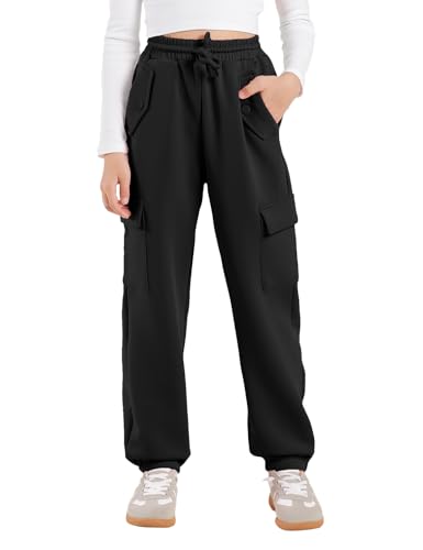 Hvididan Cargo Pants Joggers for Teen Girls, Quick Dry Casual Kids Girls Hiking Climbing Pants Slim Fit with Pockets and Drawstring, Lightweight High Waisted Trousers, Black Size 13-14 Years