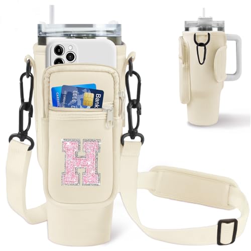 Aganmi Water Bottle Holder Pouch with Adjustable Shoulder Strap for Simple 40 oz Tumbler, Personalized Initial Letter Water Bottle Bag with Phone Pocket for Stanley Cup Accessories (Cream H)