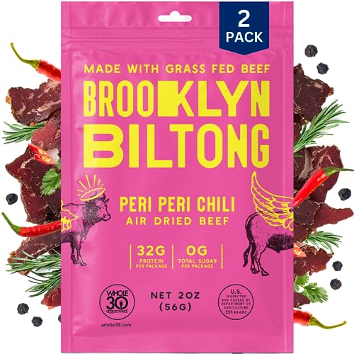 Brooklyn Biltong Air Dried Grass Fed Beef Snack, South African Beef Jerky (2 oz, Pack of 2) - Whole30 Approved, Paleo, Keto, Gluten Free, Sugar Free, Made in USA - (Peri Peri)