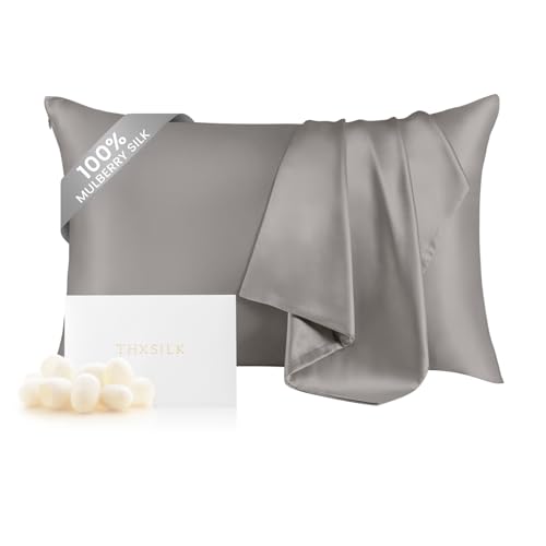 THXSILK 100% Natural Mulberry Silk Pillowcase for Hair and Skin, Grade 6A+ Pillowcase with Hidden Zipper, Soft Breathable Smooth Both Sided Silk Pillow Cover(Standard 20x26inch, Grey)