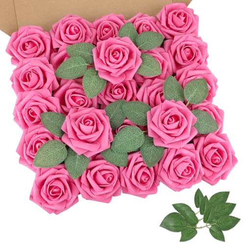 AmyHomie 25pcs Real Looking Artificial Hot Pink Roses w/Stem for DIY Wedding Bouquets Centerpieces Arrangements Party Baby Shower Home Decorations