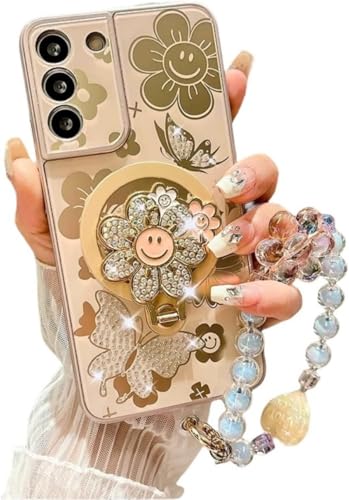 for Samsung Galaxy A26 5G Case for Women Girls with Bead Wrist Strap[Compatible with Magsafe] [Camera Lens Protector],Bling Diamond Cute Flower Kickstand Glitter Girly Phone Case for Samsung A26 Gold