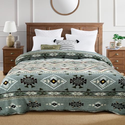CASAAGUSTO Boho Sherpa Throw Blanket, Aztec King Size Blanket, Ultra Soft, Warm, Cozy, Plush, Thick Fleece Bohemian Throw Blanket for Couch, Bed, Sofa (Olive Green 108 * 90 Inch)