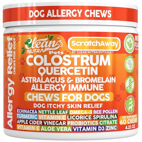 Dog Allergy Chews and Itchy Skin Relief for Dogs | Colostrum Quercetin Astragalus Bromelain | Immune Anti Itch Coat Supplement Aller Ichting Bites Treatment Paw Allergies + Echinacea Nettle Omega 3