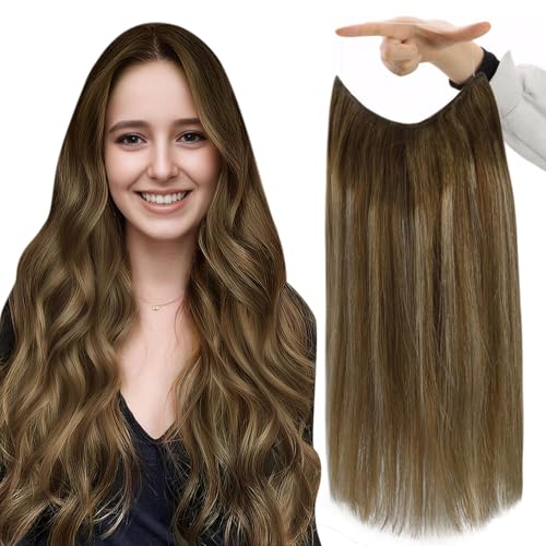 Fshine Invisible Wire Hair Extensions Balayage Medium Brown to Caramel Blonde Secret Wire Extensions with Transparent Fish Line Extension Straight Human Hair 20 Inch 80G