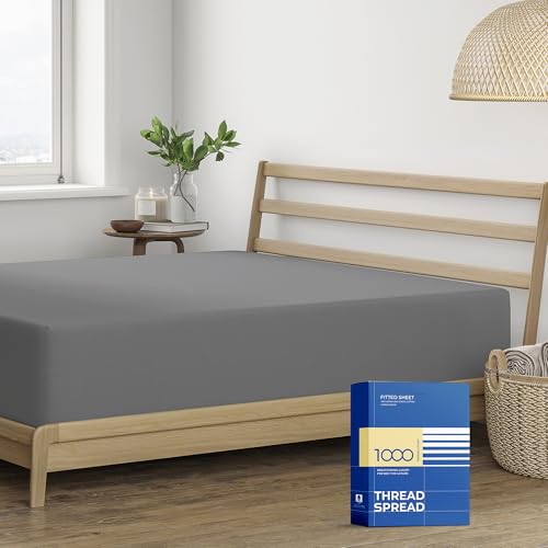 THREAD SPREAD 100% Egyptian Cotton Fitted Sheet Queen Size - 1000-Thread-Count Queen Fitted Sheet Only, Extra Soft, Cooling, 16" Deep Pocket Luxury Sateen Weave Bottom, Hotel Quality - Dark Grey