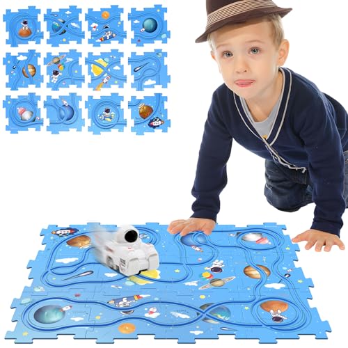 Puzzle Track Educational Play Set-Plastic Jigsaw Board & Battery Operated Toy Vehicles, Montessori Toys for Kids Ages 3-5, 2-4 Years Toddlers Puzzle Rail Car, 3 4 5 6 Year Old Boys Gift