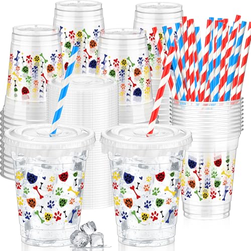 Domensi 50 Sets Blue Dog Paw Plastic Cups 12 oz Disposable Blue Dog Birthday Party Cups with Straws and Lids Circus Clear Mug Paw Themed Birthday Mugs Supplies Party Table Decoration