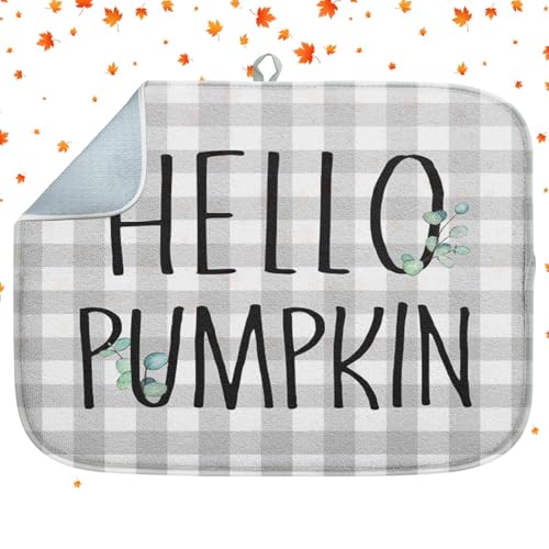Sanwarm Absorbent Dish Drying Mat, Autumn Plaid Gingham Microfiber Pad for Kitchen Counter, Fall Hello Pumpkin for Coffee Bar Decor, Heat Resistant and Reversible, 16" x 18"