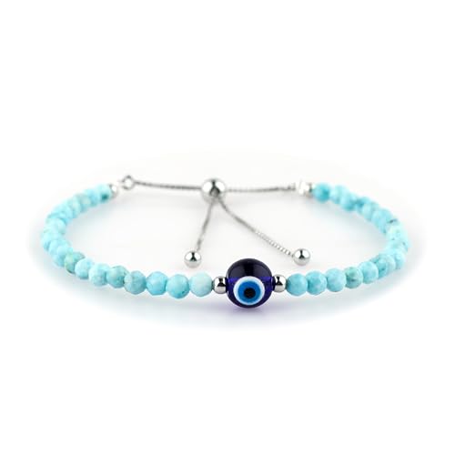 CRYSTALIS Natural Sea Larimar, Pectolite, Evil Eye, Pearl Beads Slider Bracelet for Relationship Protection, Chakra Healing Gemstone, Women Jewelry with 925 Sterling Silver Slider 10 inch