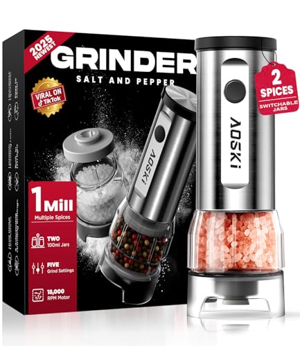 Electric Salt and Pepper Grinder Set: 1 Grinder + 2 100ml Replaceable Jars - Stainless Steel & Quick-Swap in Seconds - For Family Kitchens - Prevents Spice Mixing for Households
