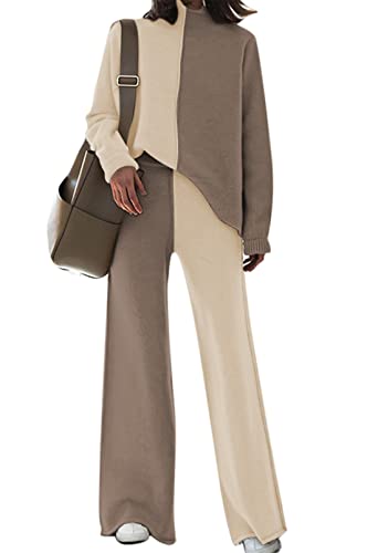 Sweater Sweatsuit for Women Set Knit Pullover Wide Leg Pants Color Block Two Piece Knitted Loungewear Beige XL