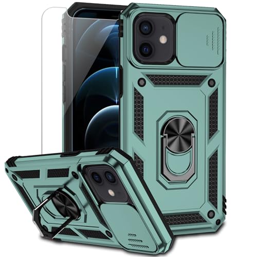 for iPhone 12 Mini Case with Camera Lens Cover Screen Protector, Dual Layer Military Grade Drop Protection Magnetic Ring Holder Kickstand Protective Phone Case for iPhone 12 Mini 5.4 inch (Dark Green)