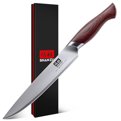 【ROSEWOOD HANDLE & G10 ROBUST BOLSTER】Constructed from natural smooth and warm rose wood that feels substantial in the hand. The carbon fiber G10 bolsters, Not only strengthen the knife but also provides a smooth transition from the blade to the handle, and never crack