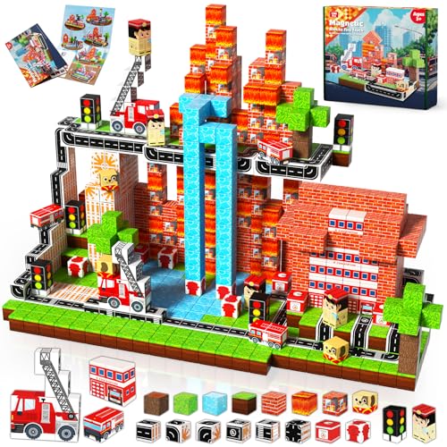 GoodyKing Magnetic Blocks|100PCS Fire Truck Magnetic Building Cube Game,Constructions Toys for Boys & Girls Age 3-4,5-8 9 10,STEM Montessori Stacking Toy,Sensory Tiles Building Christmas for Toddlers